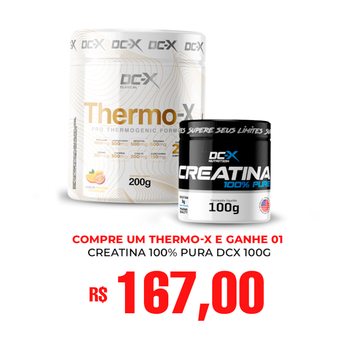 Nessa condição, você leva o Thermo-X DCX, um dos termogênicos mais completos, e ainda ganha uma Creatina 100% Pura para potencializar sua performance e evolução no treino.