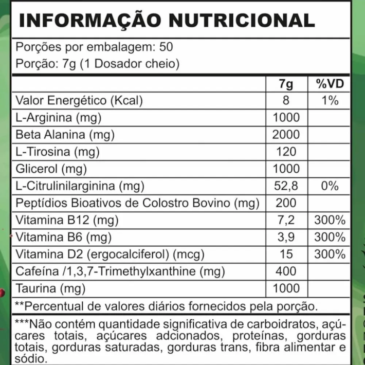 \r\nBeta-Alanina, L-Arginina, Taurina, Glicerol, Cafeína/1,3,7-Trimethylxanthine, Colostro Bovino desnatado, L-Tirosina, L-Citrulinilarginina, Cianocabalamina, Cloridrato de Piridoxina, Pó de Cogumelo Agaricus Bisporus, Pimenta Preta, Fosfato Tricálcico, Sucralose, Aroma Idêntico ao Natural de Frutas Vermelhas, Corante Rosa. *COLORIDO ARTIFICIALMENTE.