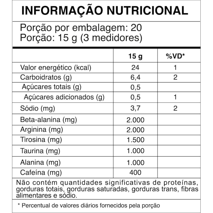 \r\n• 1.500 mg de tirosina: melhora o foco, concentração e desempenho cognitivo durante o treino